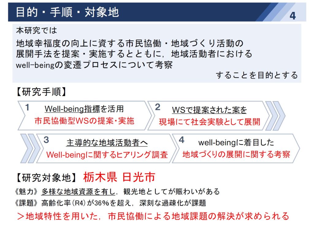 金井さんは、大学院にて「地域幸福度を考慮した地域づくり活動」に関する実践的研究を行っており、その研究対象として日光市における地域資源の活用に取り組んでいらっしゃいます。今回は、研究テーマの背景から日光との出会い、そして今後の関わり方について詳しくお話を伺いました。