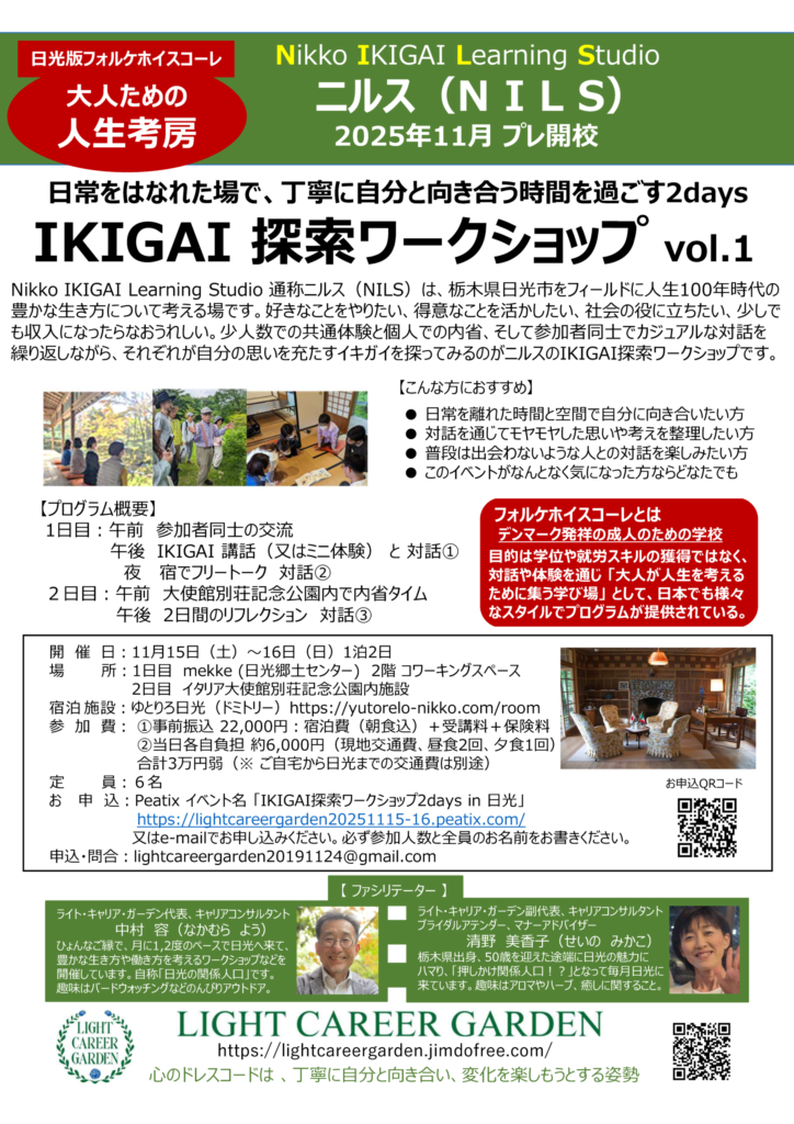 📍 詳細・申込:IKIGAI探索ワークショップ2days in 日光(Peatix)