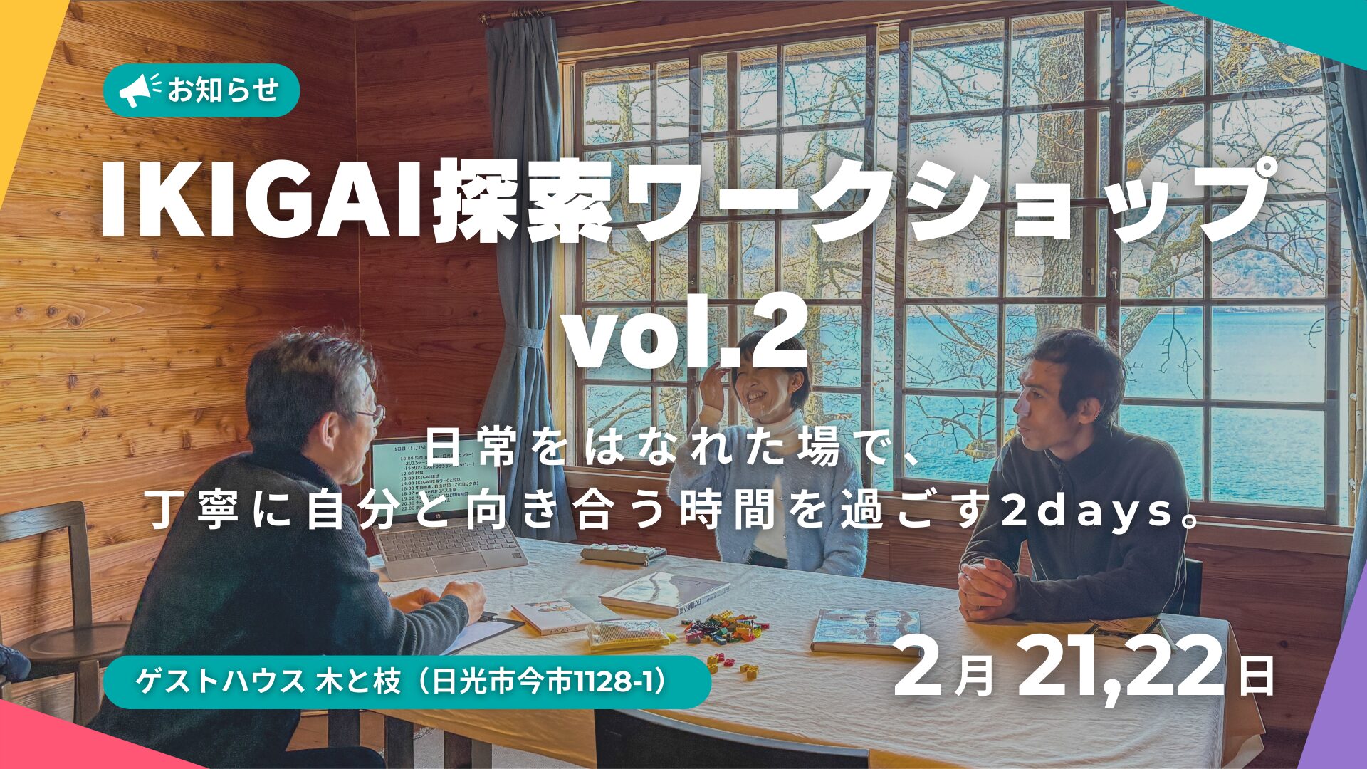 2025年11月に開校した「IKIGAI探索ワークショップ」の、2回目(Vol.2)をご案内します。今回は、日光市今市にオープンしたばかりの「ゲストハウス 木と枝」が会場です!